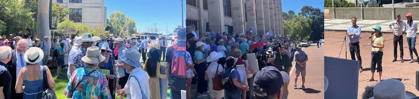 200+ members of the public lined the steps of WA State Parliament to rally to Save Matilda Bay. It was a jubilant atmosphere as people gathered from all over suburban Perth to highlight the importance of preserving Matilda Bay, now and for generations to come.