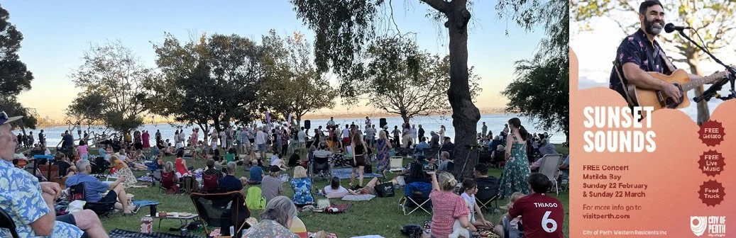Sunday 22 February 2026 @ 5.30pm - Sunset Sounds Community Concert, presented in partnership with the City of Perth - Matilda Bay Reserve, south of UWA Boat Club, opposite Somerville Auditorium - More details on the Visit Perth website