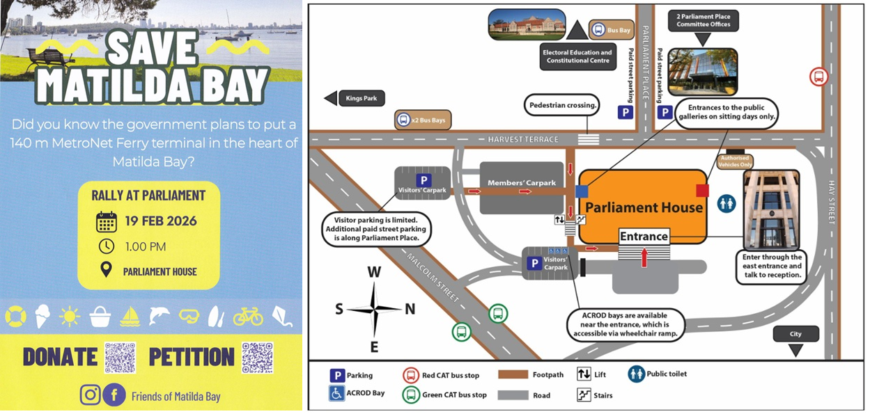 Thursday 19 February 2026 - Save Matilda Bay Petition presented @ 9am and Rally @ 1pm in front of Entrance to WA State Parliament, Parliament House, 4 Harvest Terrace, West Perth
